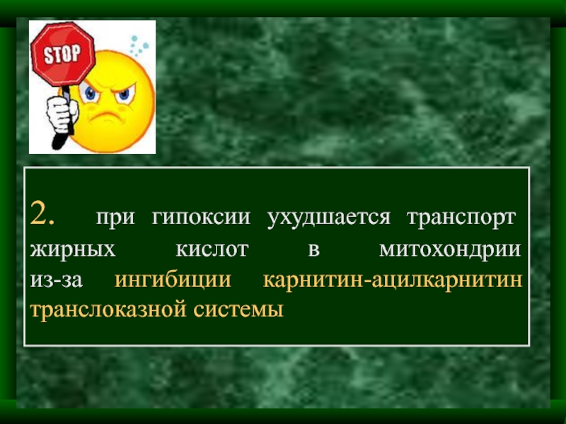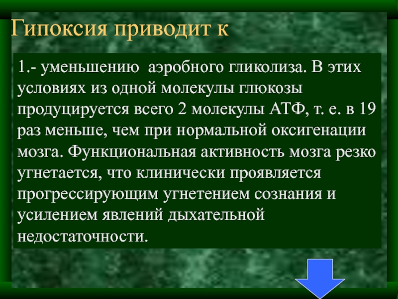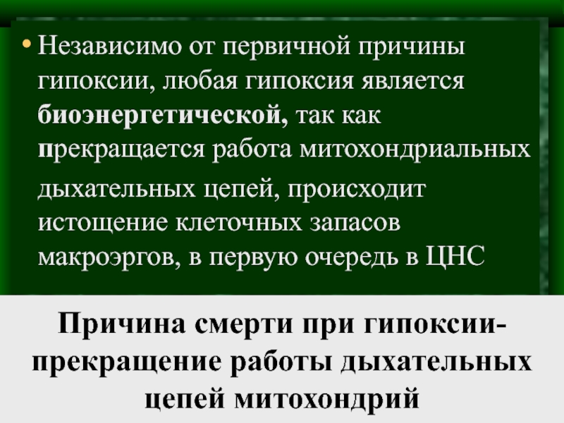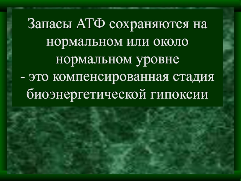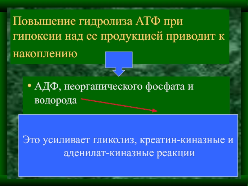 Слайд 74Повышение гидролиза АТФ при гипоксии над ее продукцией приводит к