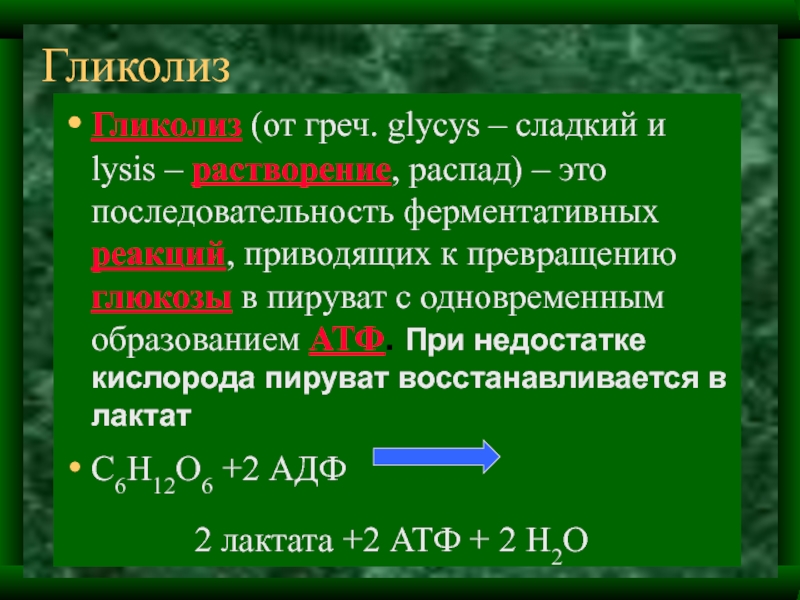 глюкозы в пируват с одновременным образованием АТФ. При недостатке кислорода пируват восстанавливается в лактат