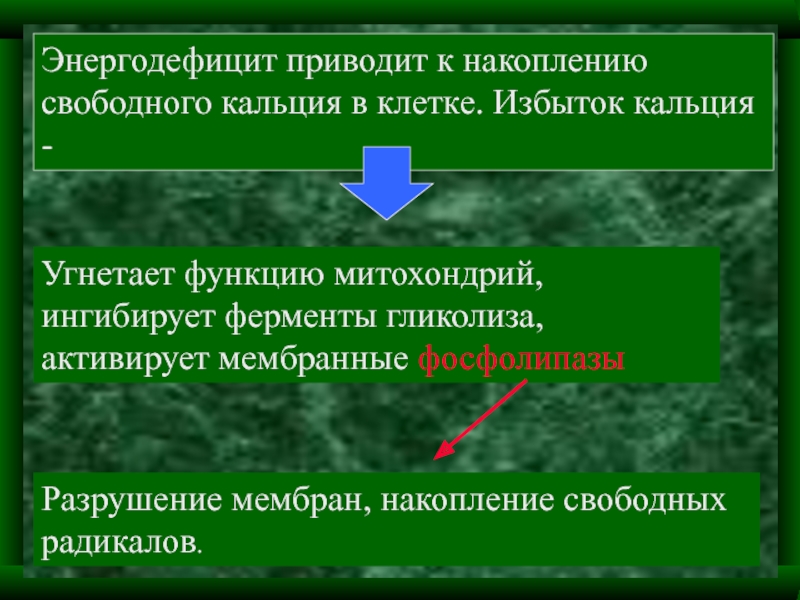 Слайд 79Энергодефицит приводит к накоплению свободного кальция в клетке. Избыток кальция