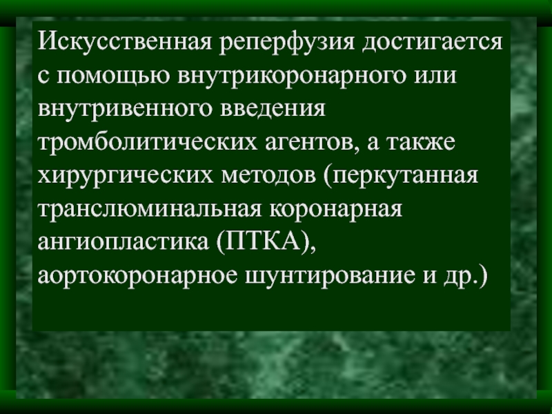 Слайд 86Искусственная реперфузия достигается с помощью внутрикоронарного или внутривенного введения тромболитических