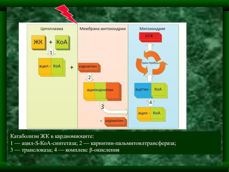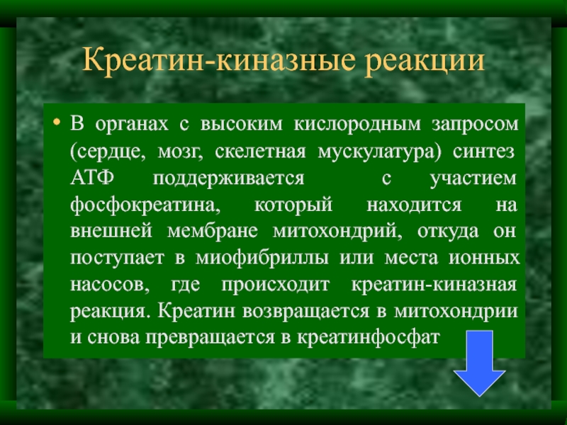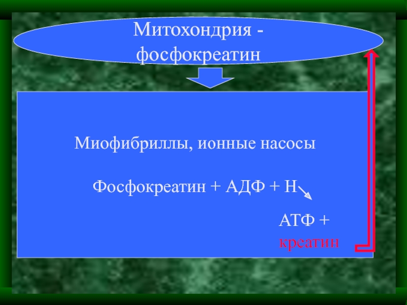 внешней мембране митохондрий, откуда он поступает в миофибриллы или места ионных насосов, где происходит креатин-киназная реакция. Креатин возвращается в митохондрии и снова превращается в креатинфосфат