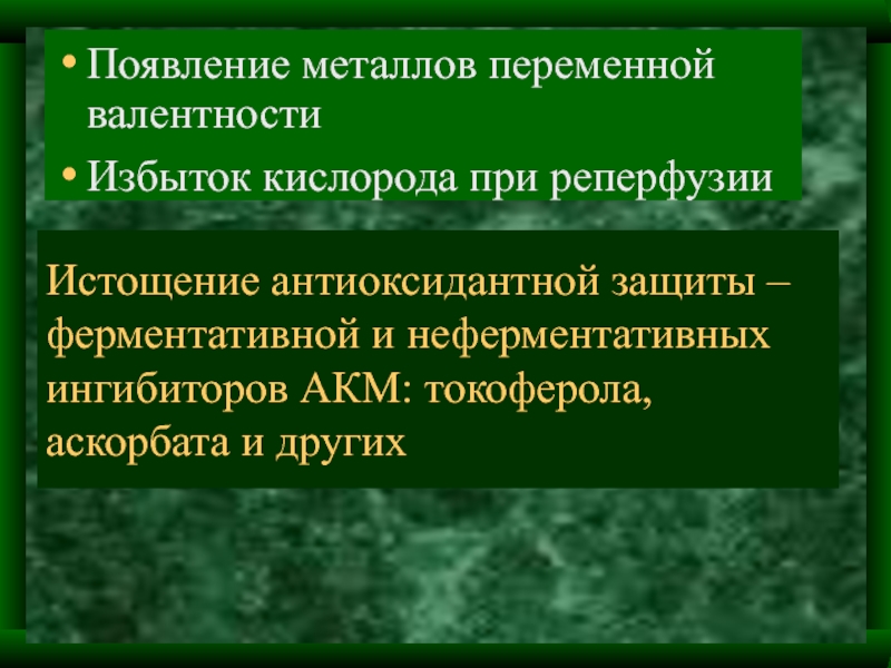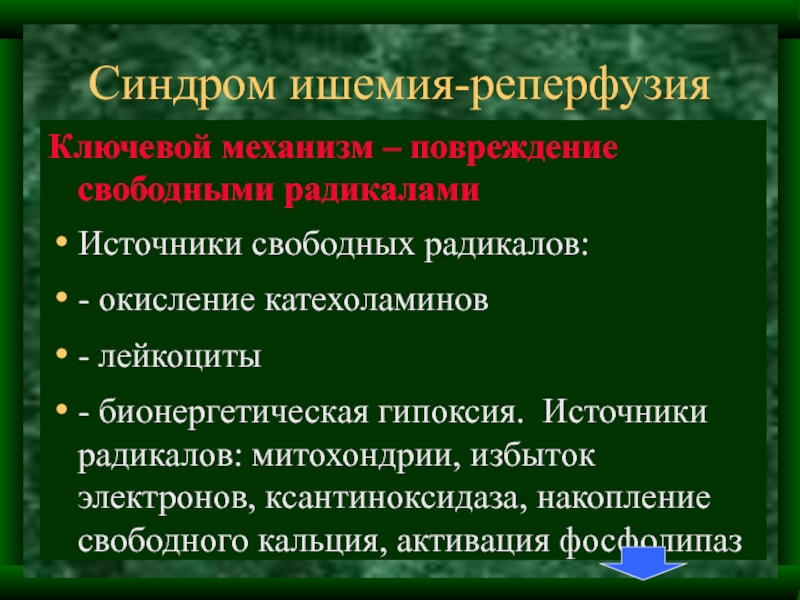 - бионергетическая гипоксия. Источники радикалов: митохондрии, избыток электронов, ксантиноксидаза,