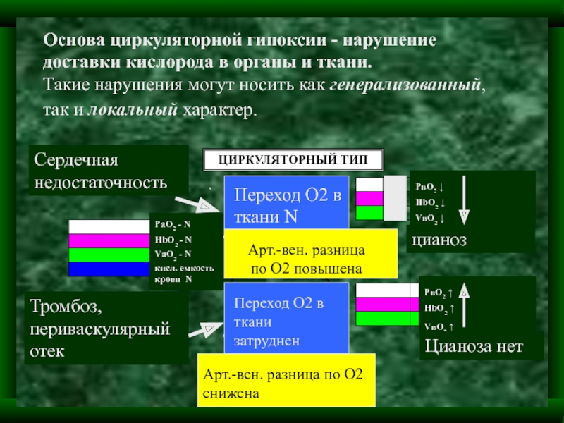 Слайд 12Основа циркуляторной гипоксии - нарушение доставки кислорода в органы и