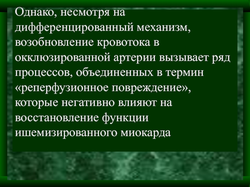 Слайд 87Однако, несмотря на дифференцированный механизм, возобновление кровотока в окклюзированной артерии