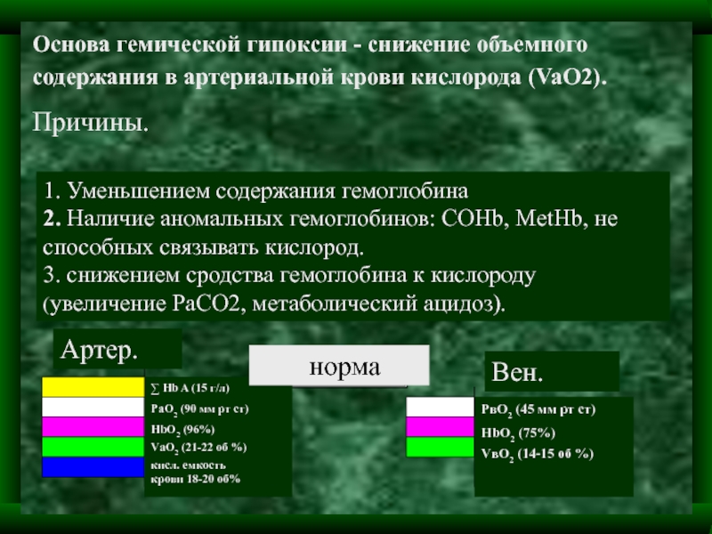 Основа гемической гипоксии - снижение объемного содержания в артериальной крови