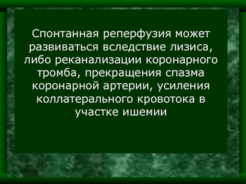 Слайд 85Спонтанная реперфузия может развиваться вследствие лизиса, либо реканализации коронарного тромба,