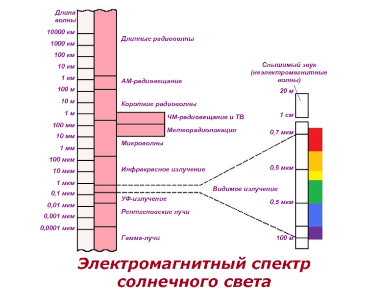 ДлинаволныДлинные радиоволныАМ-радиовещаниеКороткие радиоволныЧМ-радиовещание и ТВМетеорадиолокацияМикроволныИнфракрасное излучениеУФ-излучениеРентгеновские лучиГамма-лучи10000 км1000 км100 км10 км1 км100 м10 м1 м100 мм10 мм1