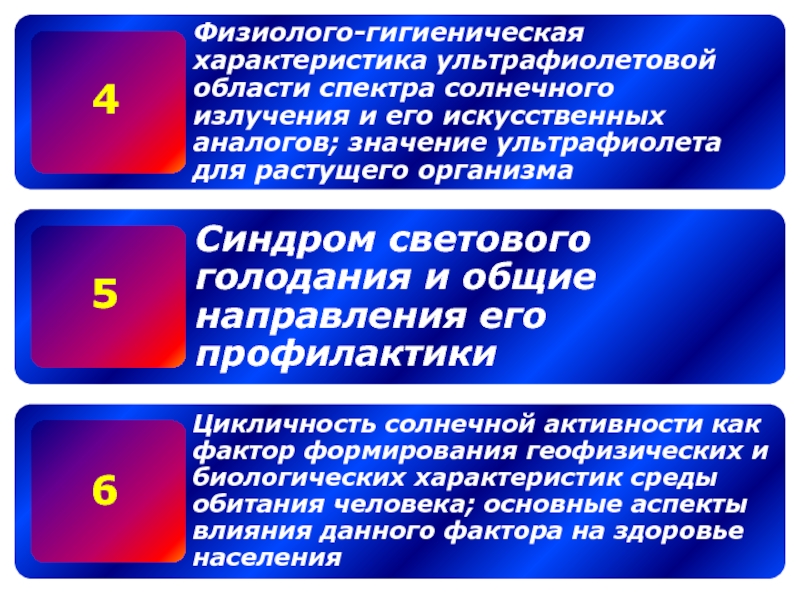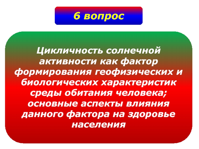 6 вопросЦикличность солнечнойактивности как факторформирования геофизических ибиологических характеристиксреды обитания человека;основные аспекты влиянияданного фактора на здоровьенаселения