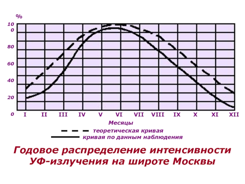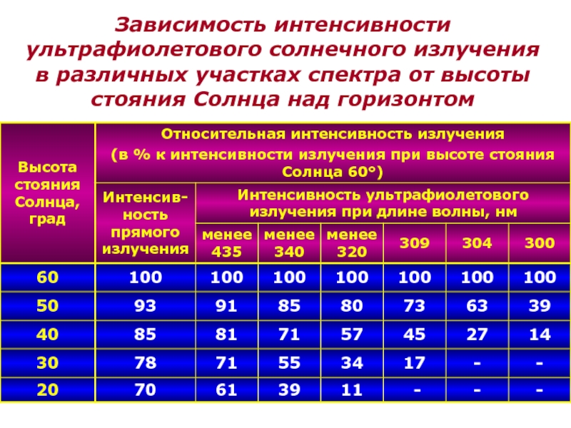 Зависимость интенсивностиультрафиолетового солнечного излученияв различных участках спектра от высотыстояния Солнца над горизонтом
