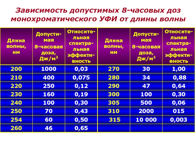 Зависимость допустимых 8-часовых дозмонохроматического УФИ от длины волны