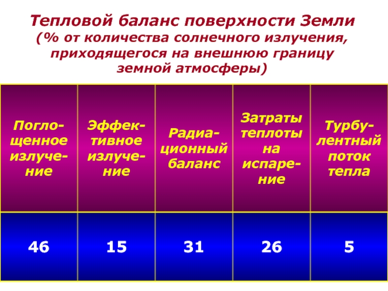 Тепловой баланс поверхности Земли(% от количества солнечного излучения,приходящегося на внешнюю границуземной атмосферы)