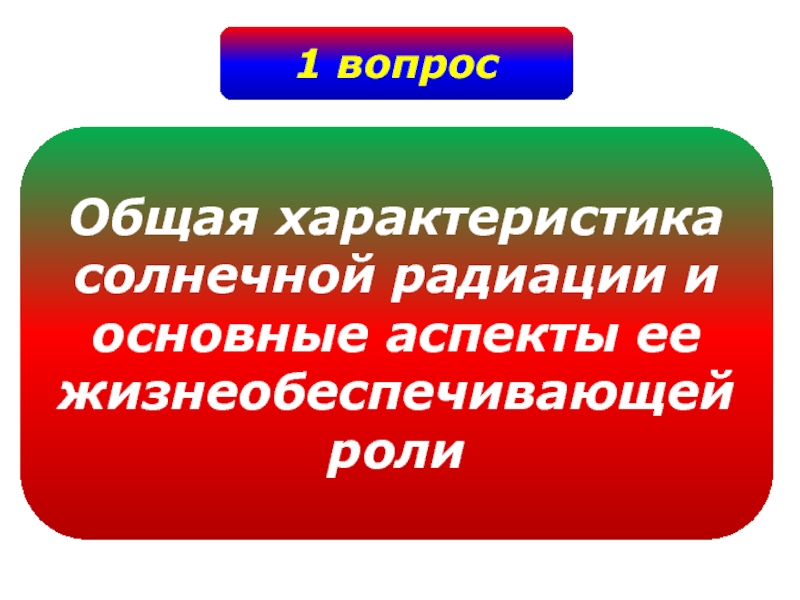 1 вопросОбщая характеристикасолнечной радиации иосновные аспекты еежизнеобеспечивающейроли