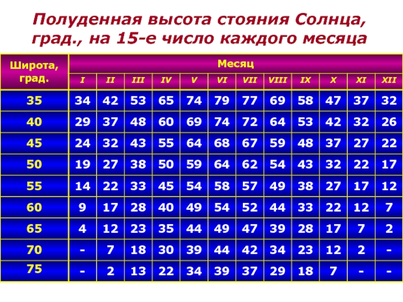 Полуденная высота стояния Солнца,град., на 15-е число каждого месяца
