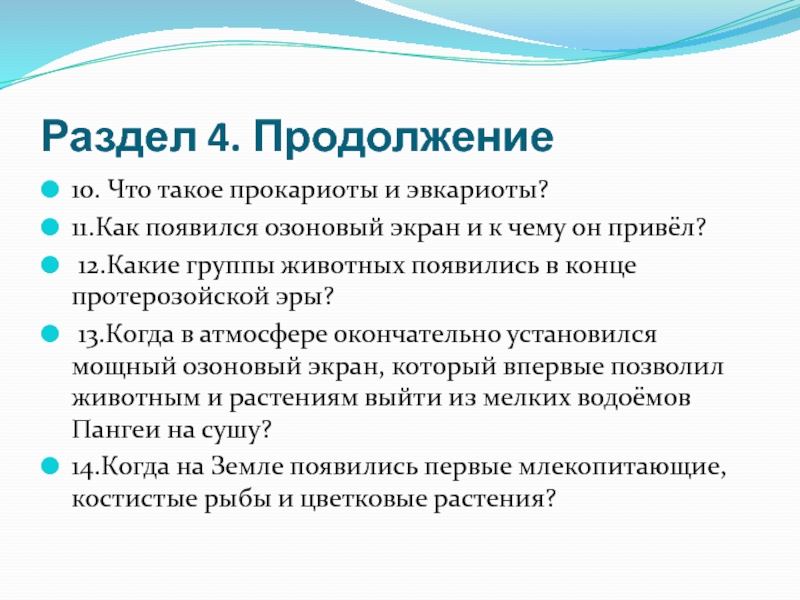Раздел 4. Продолжение10. Что такое прокариоты и эвкариоты?11.Как появился озоновый экран и к чему он привёл? 12.Какие