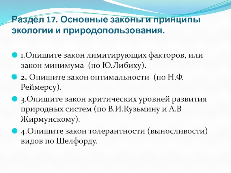 Слайд 36Раздел 17. Основные законы и принципы экологии и природопользования.