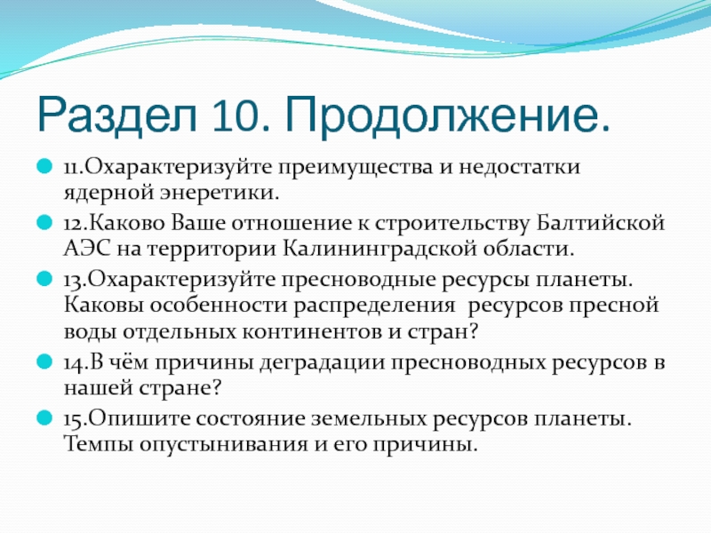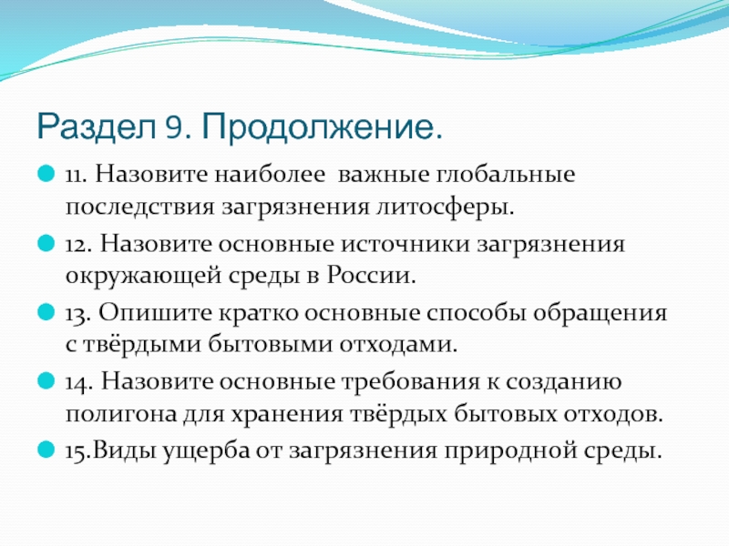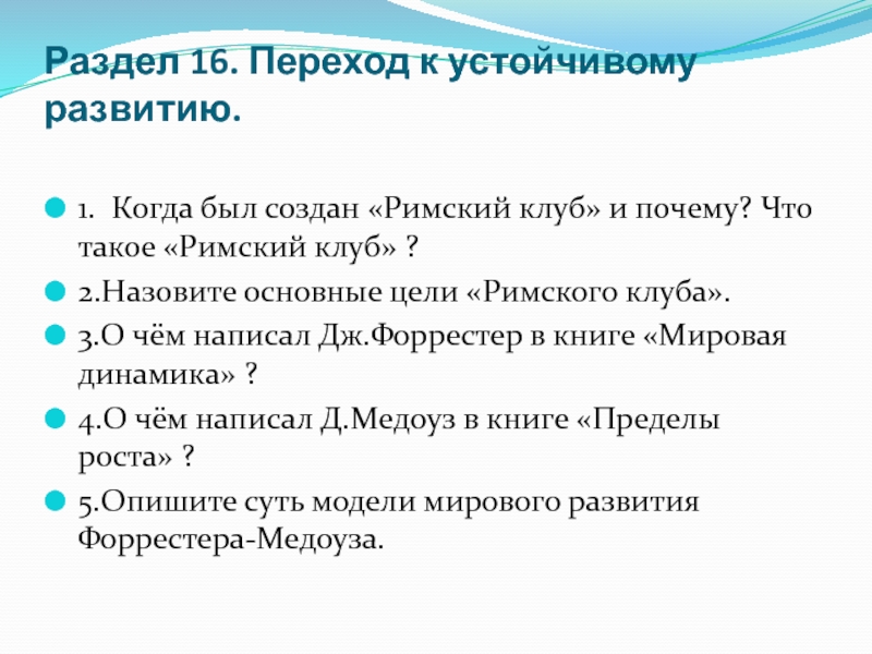 Раздел 16. Продолжение.6.Что такое «устойчивое развитие» ?7.Что должно сохранять «устойчивое развитие» ?8.Назовите основные принципы устойчивого развития.9.Назовите ограничительные