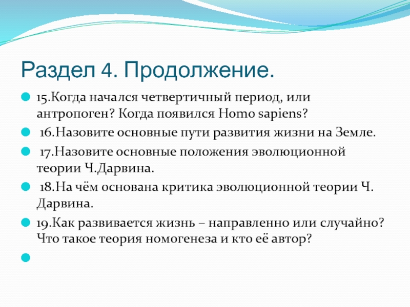 Раздел 4. Продолжение.15.Когда начался четвертичный период, или антропоген? Когда появился Homo sapiens? 16.Назовите основные пути развития жизни