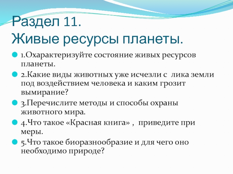 Раздел 11. Живые ресурсы планеты.1.Охарактеризуйте состояние живых ресурсов планеты.2.Какие виды животных уже исчезли с лика земли