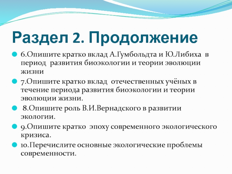 Раздел 2. Продолжение6.Опишите кратко вклад А.Гумбольдта и Ю.Либиха в период развития биоэкологии и теории эволюции жизни7.Опишите кратко