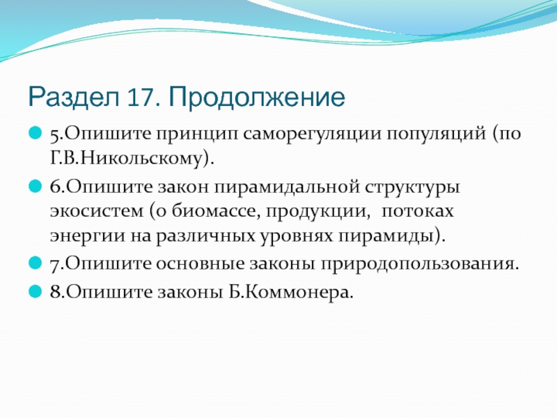 Раздел 17. Продолжение5.Опишите принцип саморегуляции популяций (по Г.В.Никольскому).6.Опишите закон пирамидальной структуры экосистем (о биомассе, продукции, потоках энергии