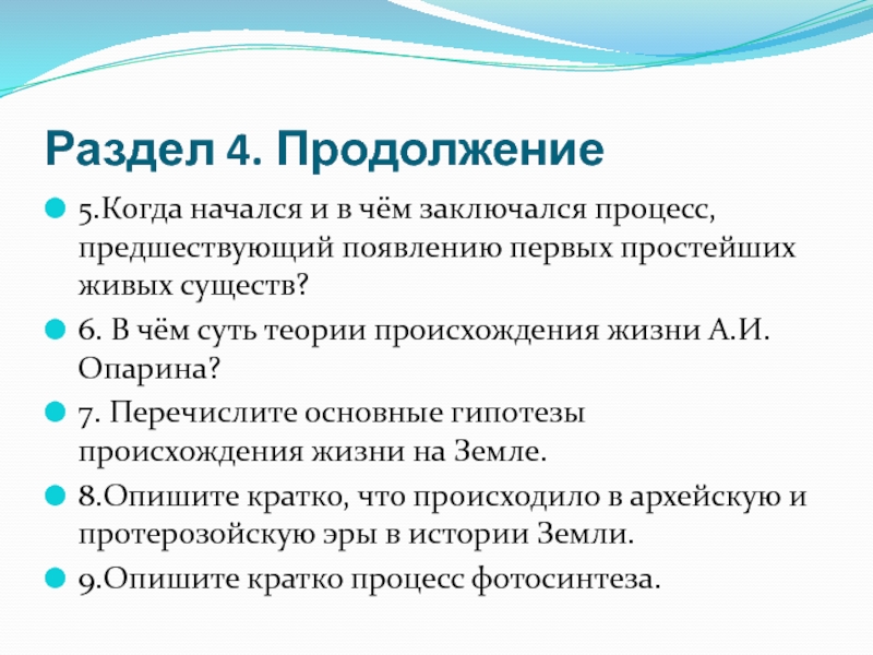 Раздел 4. Продолжение5.Когда начался и в чём заключался процесс, предшествующий появлению первых простейших живых существ?6. В чём