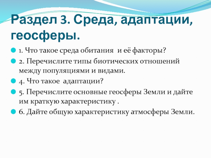 Раздел 3. Среда, адаптации, геосферы.1. Что такое среда обитания и её факторы?2. Перечислите типы биотических отношений между
