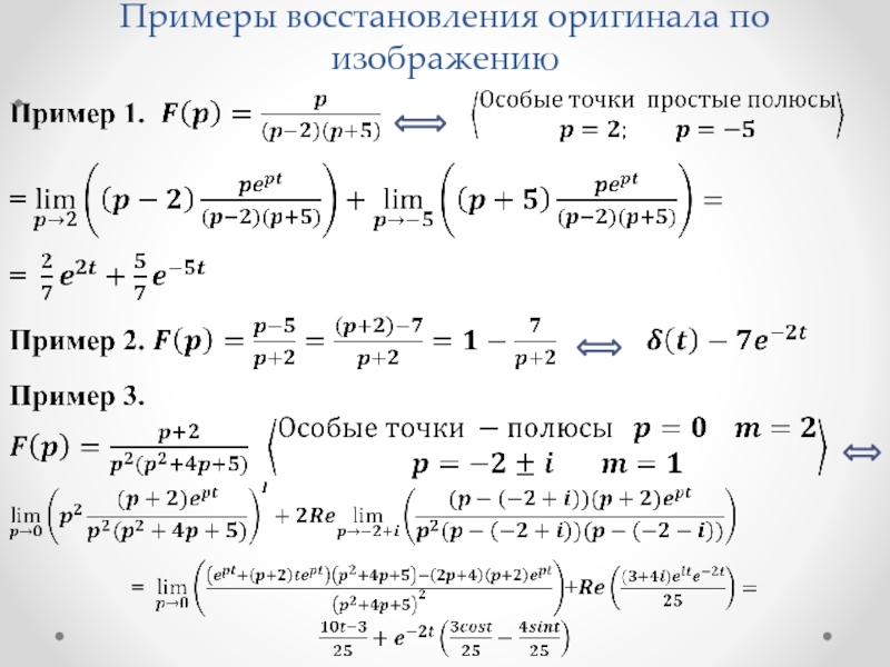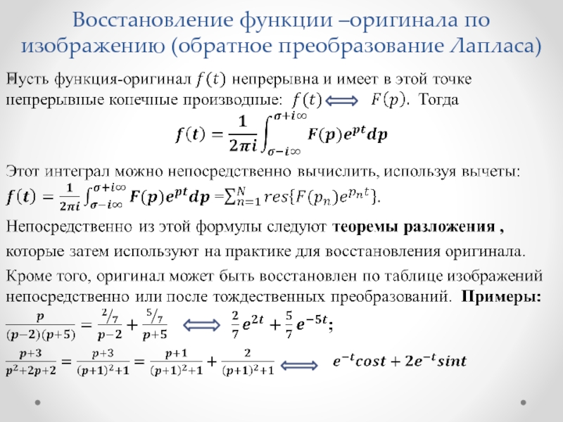 Слайд 7Восстановление функции –оригинала по изображению (обратное преобразование Лапласа)