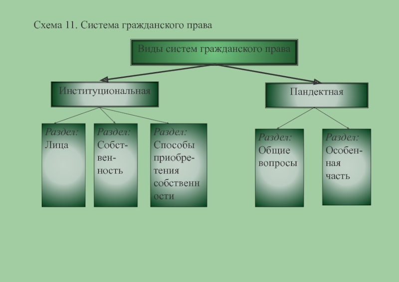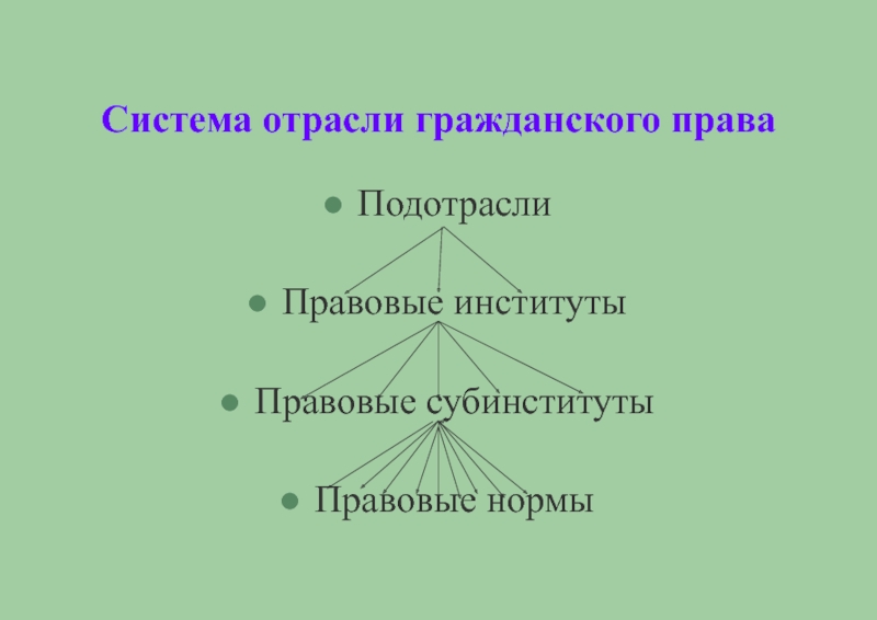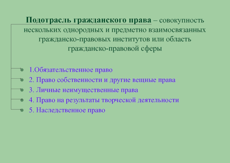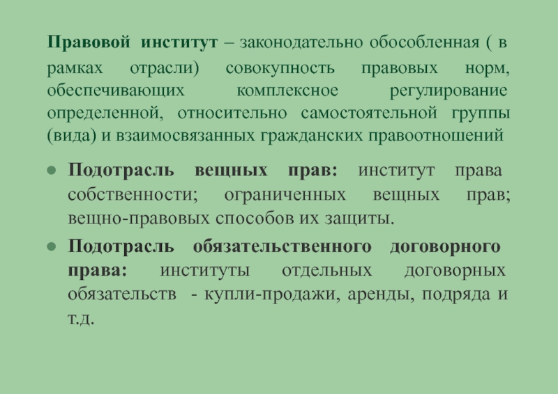 Подотрасль вещных прав: институт права собственности; ограниченных вещных прав; вещно-правовых способов их защиты.