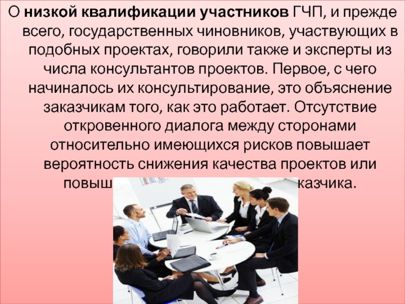 Слишком сложная процедура принятия решений, низкая прозрачность проектов, слабый риск-менеджмент, низкая квалификация государственных служащих, отсутствие механизмов накопления и передачи опыта;