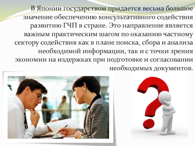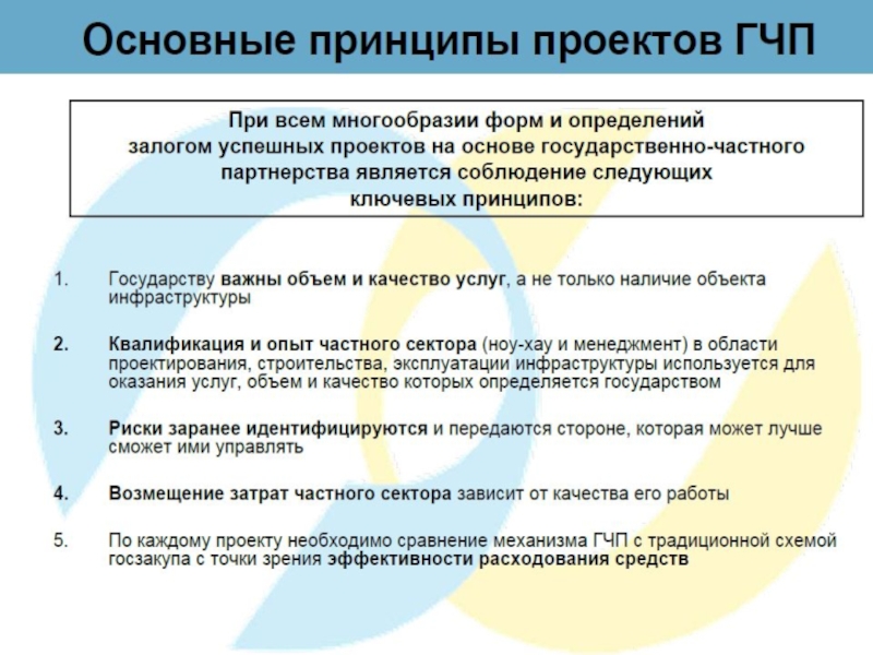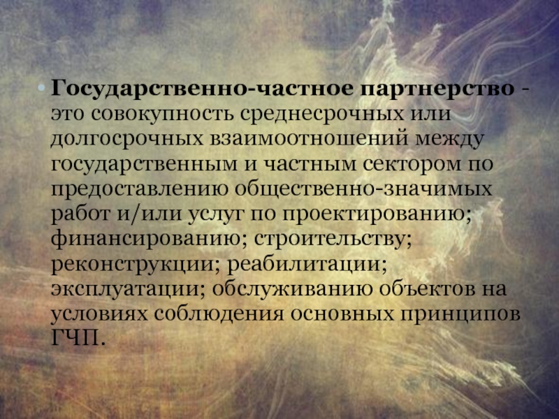 ГЧП – это совместная работа государственного и частного секторов, реализующаяся на основе контракта или создания совместного предприятия для обеспечения строительства/ремонта инфраструктурных объектов или услуг. ГЧП – это долгосрочная договоренность на основе контракта по проектированию, строительству, финансированию и эксплуатации/предоставлению услуги