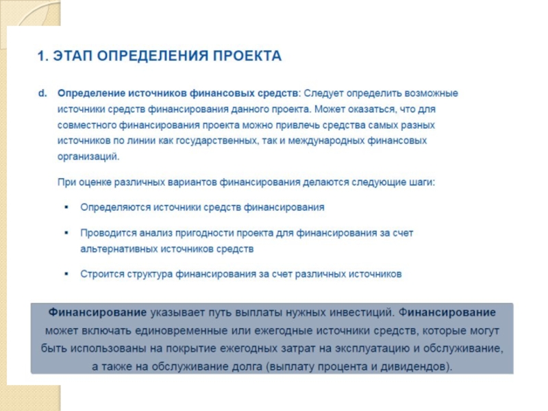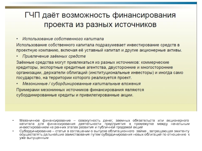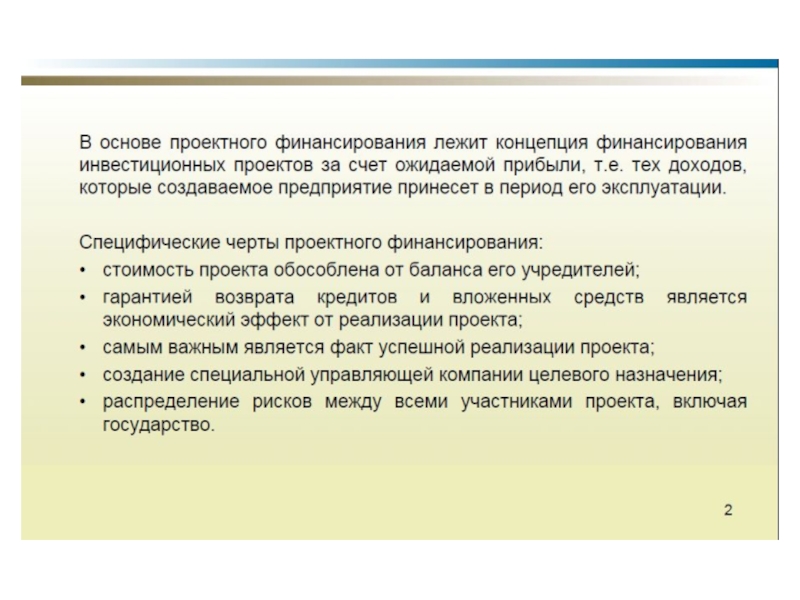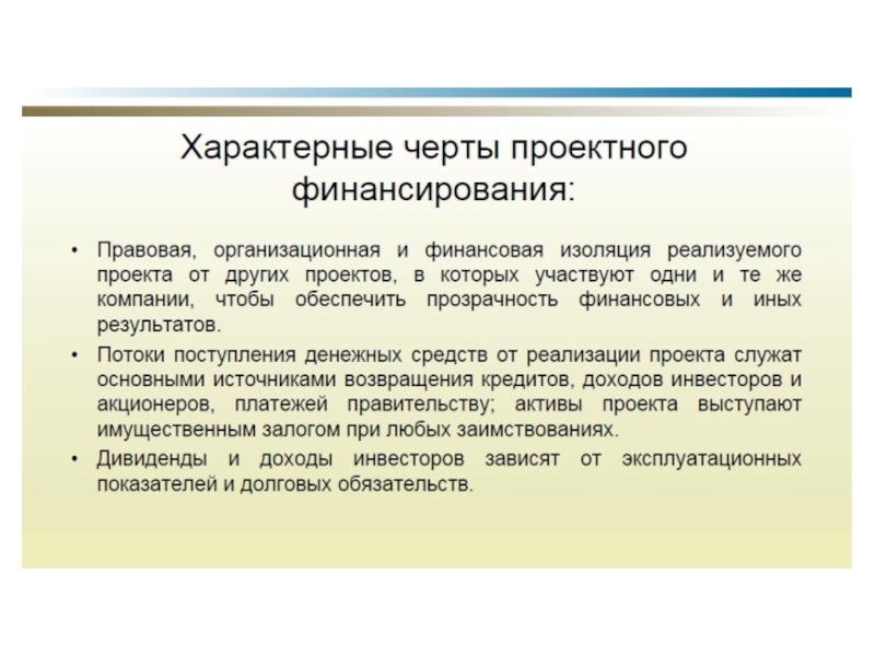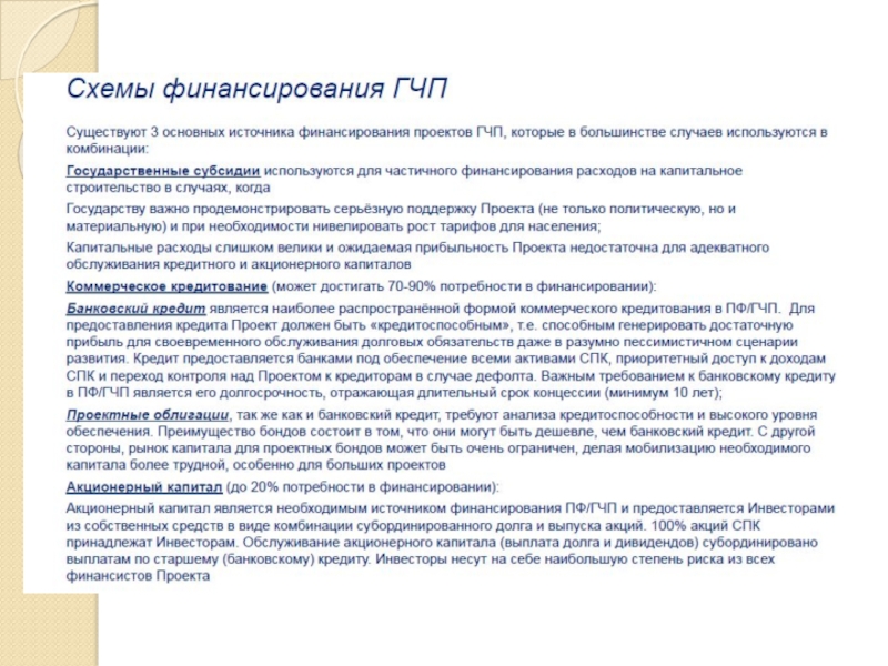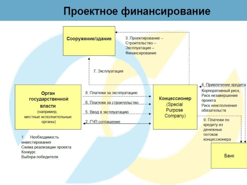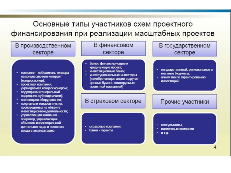 - специфические формы финансирования проектов: за счет частных инвестиций, дополненных государственными финансовыми ресурсами (нередко значительными), или же совместное инвестирование нескольких участников;