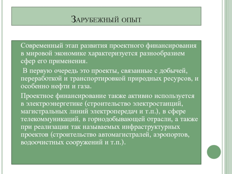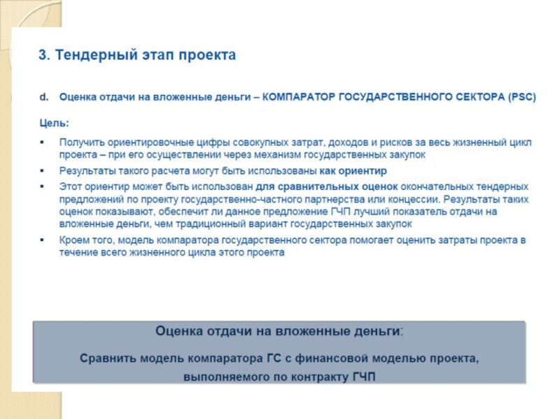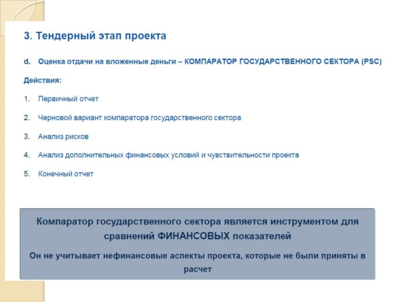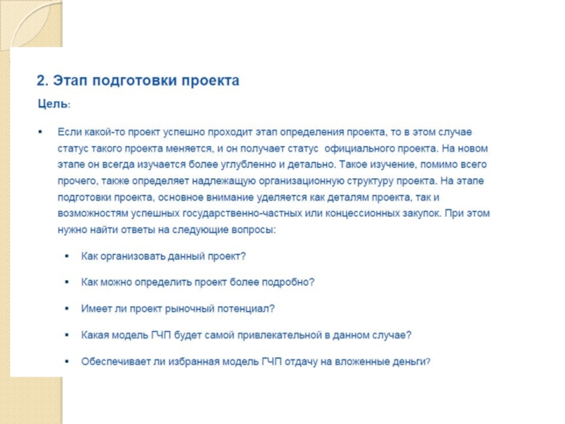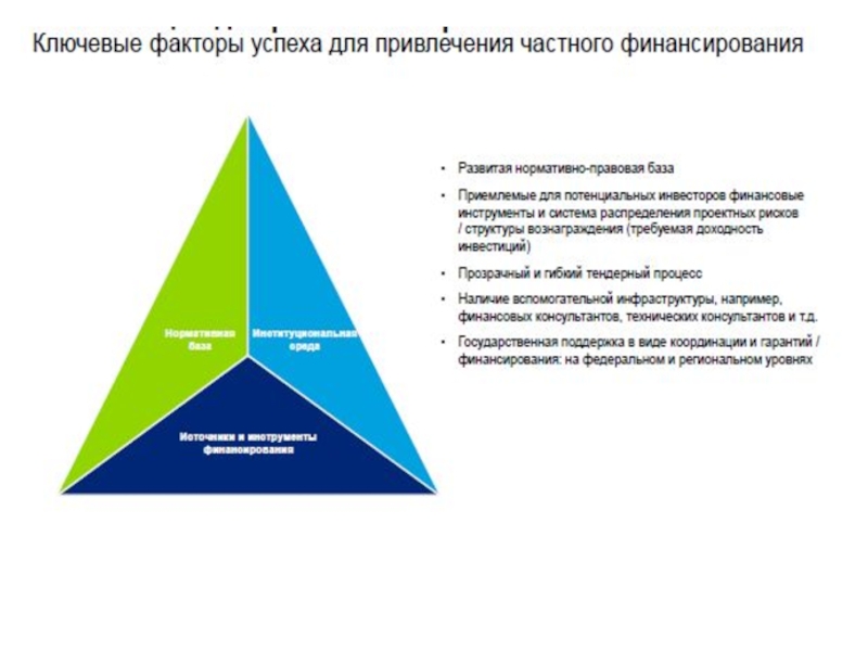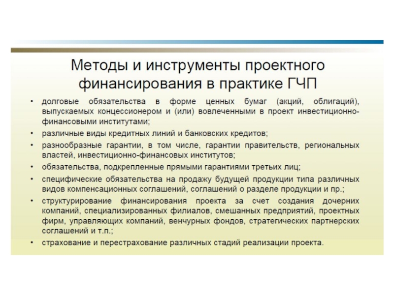 базы, прежде всего на государственном уровне, легитимизирующей ГЧП как в инфраструктурных отраслях, так и в инновационной сфере.Разработка закона «О проектном финнасировании»