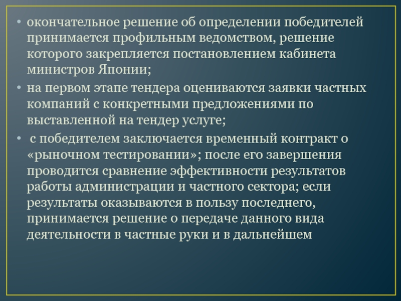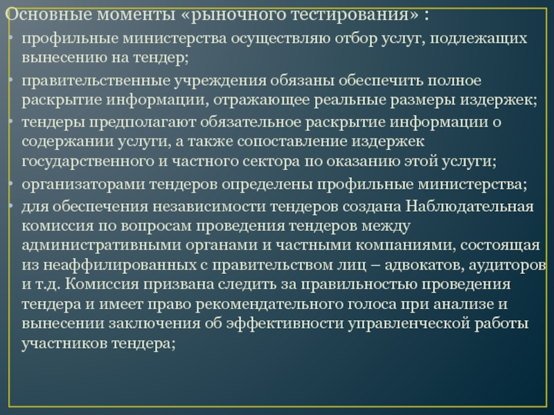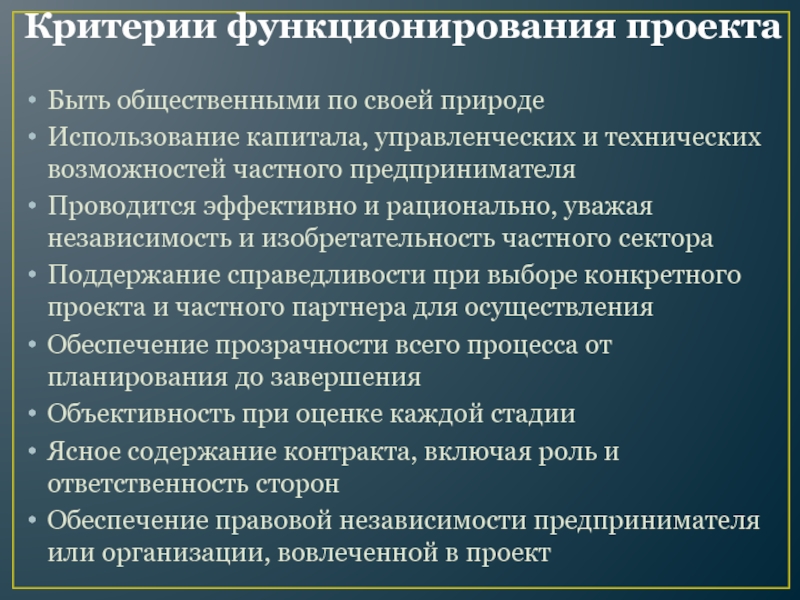 - реализация партнерских отношений в условиях конкурентной среды, когда за каждый контракт или концессию происходит конкурентная борьба между несколькими потенциальными участниками;