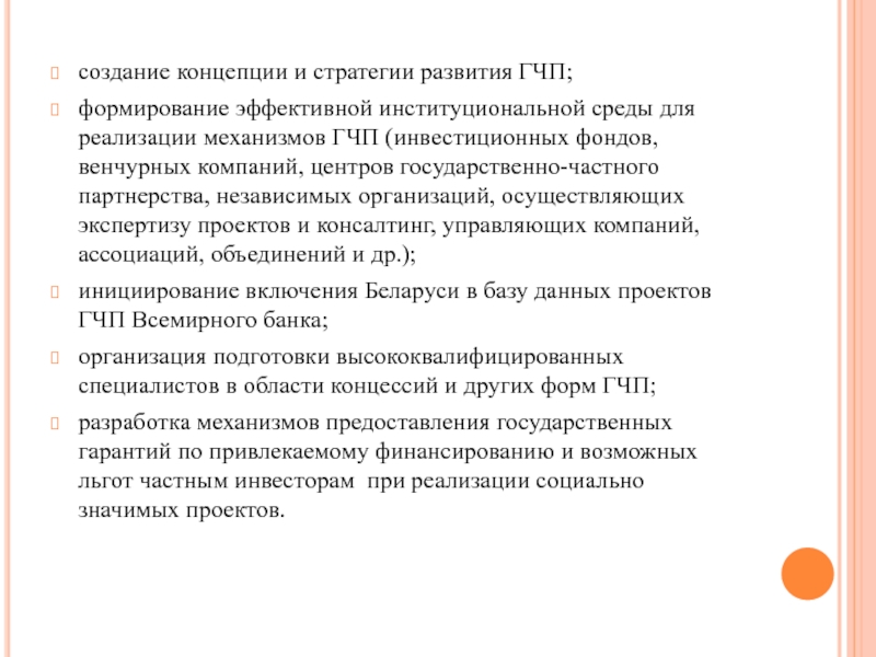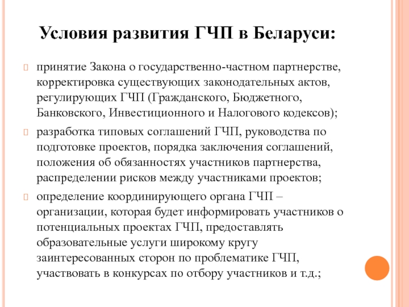 Создание единого государственного органа по вопросам ГЧП, выработка единой концепции развития ГЧП в Республике Беларусь.