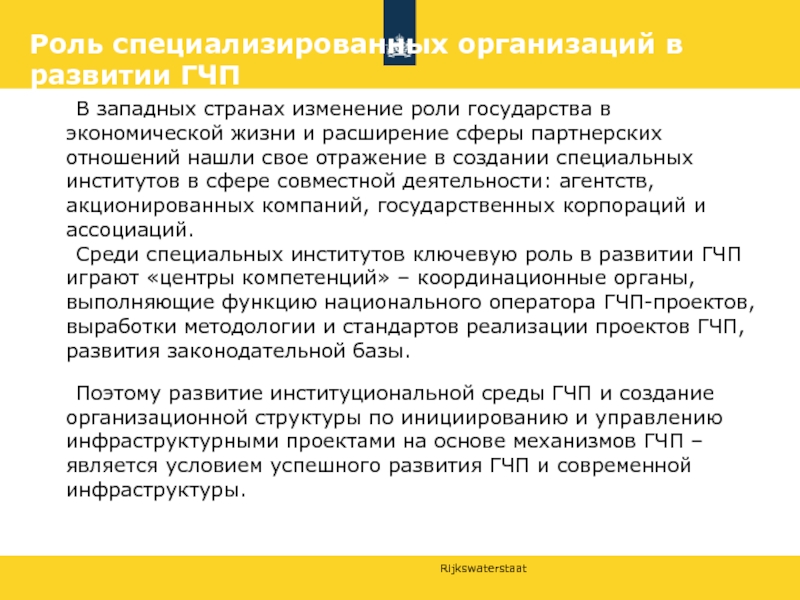 • ГЧП институционального характера, когда сотрудничество между государственным и частным партнером осуществляется в результате образования отдельного юридического лица (совместное предприятие, специальная компания).
