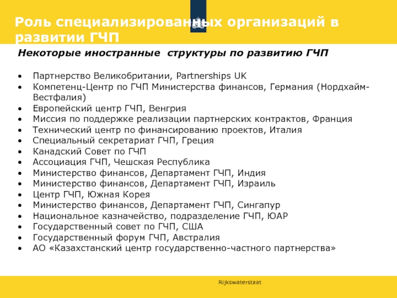 Второе. Создание организационной и управляющей структуры по вопросам ГЧП в составе соответствующих министерств инфраструктуры и инновационной сферы (при ГКНТ).