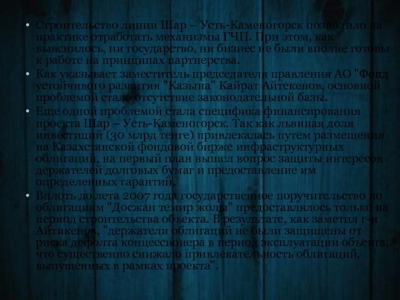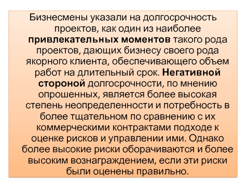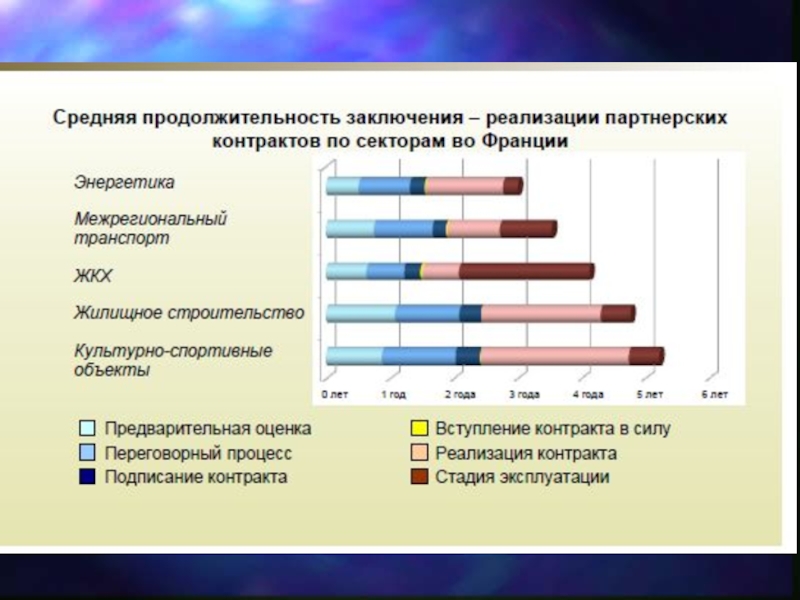 ряде случаев и достаточно длительные сроки действия соглашений о партнерстве (от 10-15 до 20 и более лет, в случае концессий – до 50 лет). Временная ограниченность четко соблюдается: проекты обычно разрабатываются под конкретный объект (порт, дорога, объект социальной инфраструктуры и т.п.), который должен быть завершен к определенному сроку;