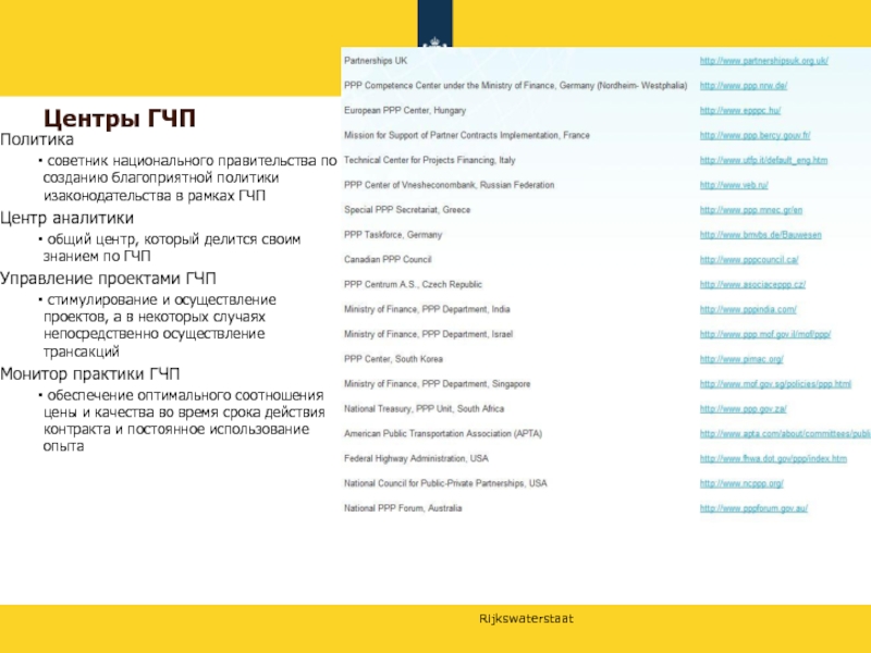 ГЧП- это совместное предприятие между государственным и частным секторами, опирающееся на опыт каждого партнера, наилучшим образом удовлетворяющее четко сформулированные потребности государства посредством соответствующего предоставления и распределения ресурсов, рисков и прибыли
