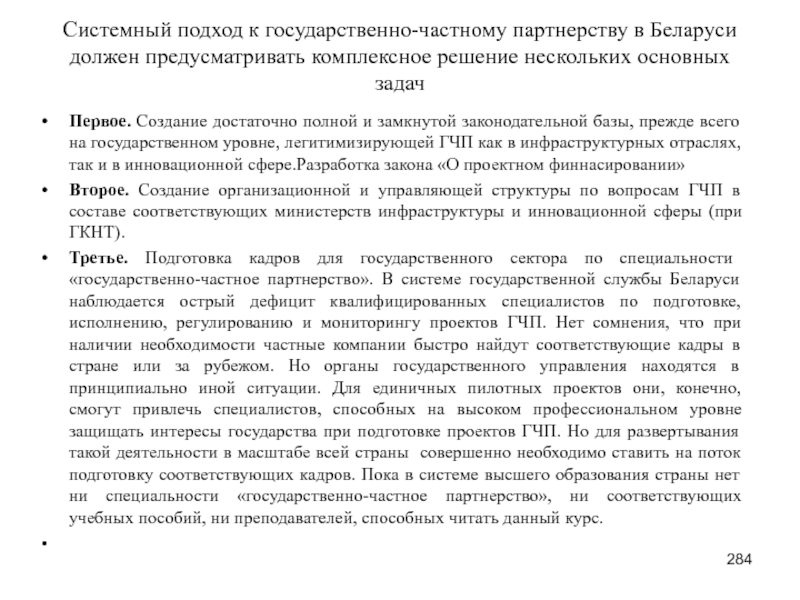 Слайд 284Системный подход к государственно-частному партнерству в Беларуси должен предусматривать комплексное