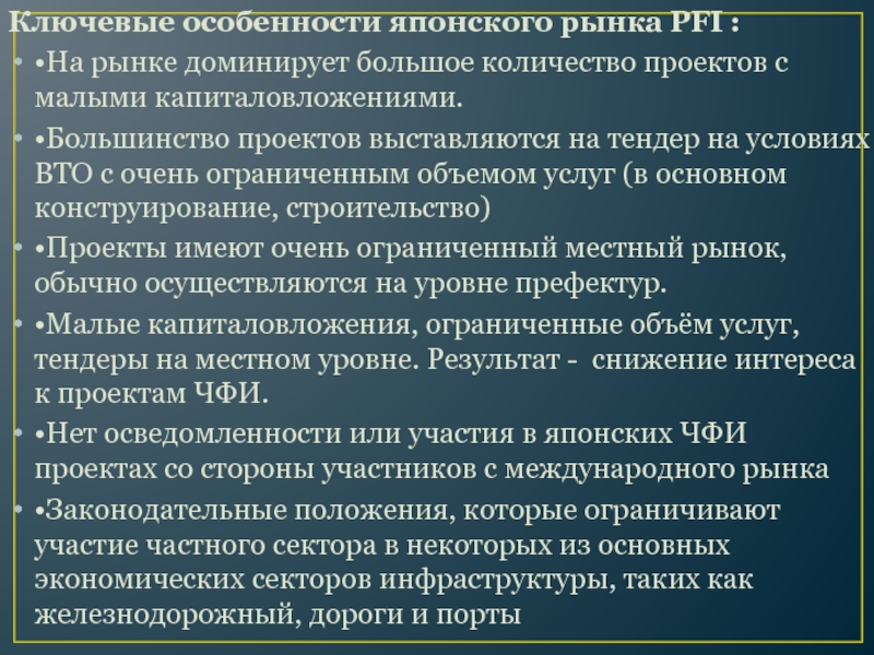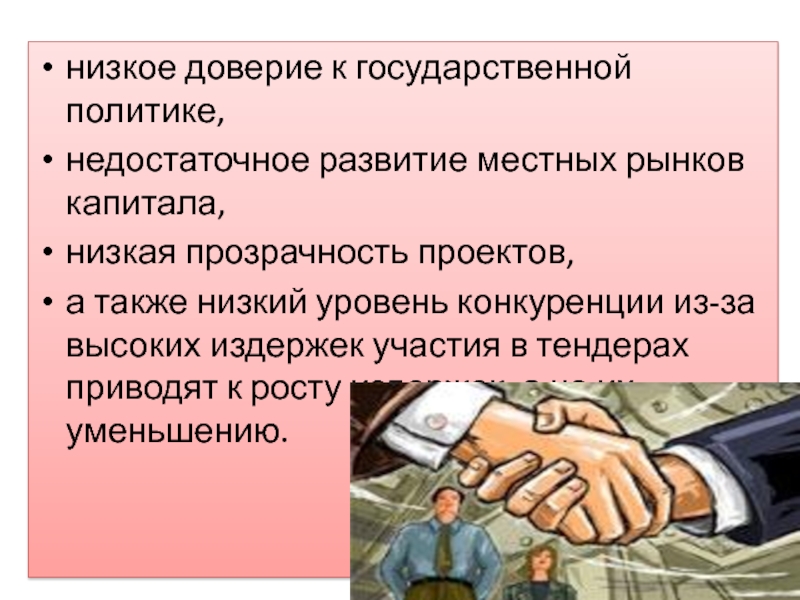 Недостаточное развитие местных рынков капитала, недостаточное количество инструментов и механизмов привлечения долгосрочных финансовых ресурсов по приемлемым ценам – часто стоимость частных денег выше по сравнению с государственными ресурсами, что приводит к удорожанию проекта;