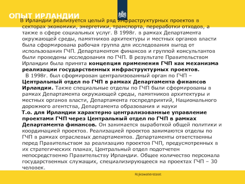 Т.о. для Ирландии характерно централизованные управление проектами ГЧП через Центральный отдел по ГЧП в рамках Департамента финансов. Он занимается выработкой общей политики и координацией проектов. Реализацией проектов занимаются отделы по ГЧП в рамках отраслевых департаментов. Департаменты ответственны перед Правительством за реализацию проектов ГЧП, предусмотренных в их стратегических планах, Центральный отдел подотчетен непосредственно Правительству Ирландии. Общее количество персонала государственных служащих, специализирующееся на проектах ГЧП – 30 человек.