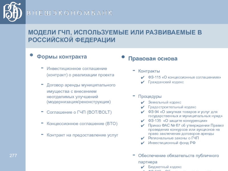 Слайд 277МОДЕЛИ ГЧП, ИСПОЛЬЗУЕМЫЕ ИЛИ РАЗВИВАЕМЫЕ В РОССИЙСКОЙ ФЕДЕРАЦИИ