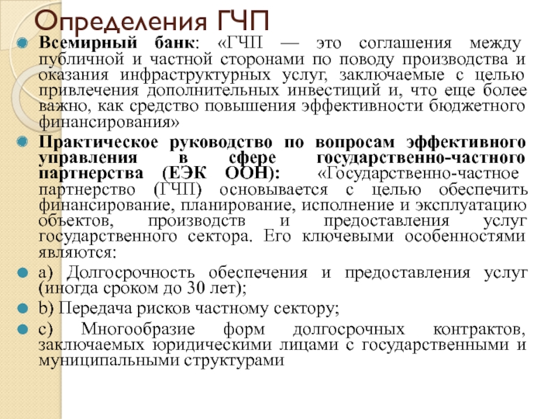 Практическое руководство по вопросам эффективного управления в сфере государственно-частного партнерства (ЕЭК ООН): «Государственно-частное партнерство (ГЧП) основывается с целью обеспечить финансирование, планирование, исполнение и эксплуатацию объектов, производств и предоставления услуг государственного сектора. Его ключевыми особенностями являются: