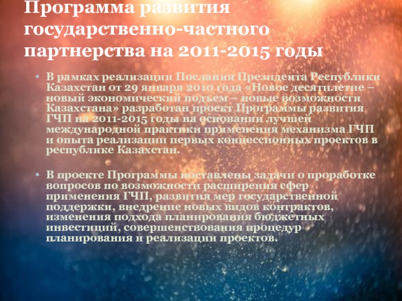 ГЧП – эффективное улучшение социальной инфраструктуры , гарантирование предоставления доступных и качественных услуг населению путем осуществления мероприятий по привлечению к управлению объектов государственной собственности частного финансирования, управленческих и технических возможностей, обеспечивающих позитивный вклад в развитие экономики