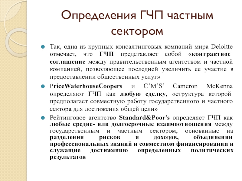 Deloitte отмечает, что ГЧП представляет собой «контрактное соглашение между правительственным