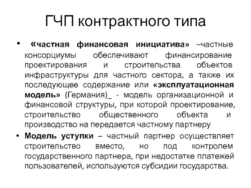 • ГЧП чисто контрактного типа, в которых участие частного капитала в госпредприятиях основывается исключительно на договорных отношениях (частная финансовая инициатива, модель «уступки»);