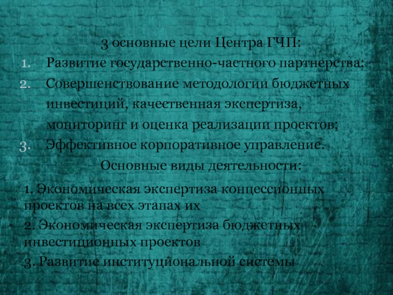 объединение усилий общественных, деловых и государственных структур для выработки и реализации единой концепции развития государственно-частного партнерства в России, а также расширения практики применения механизмов ГЧП в регионах.
