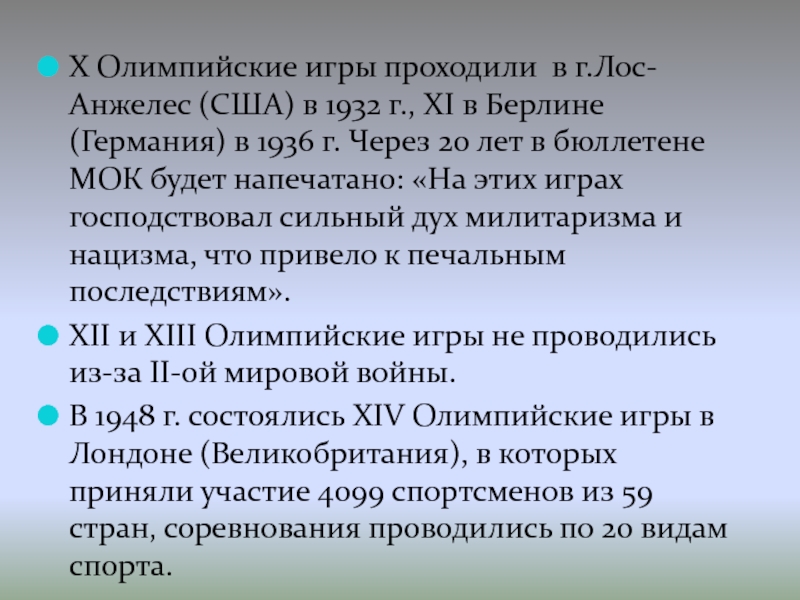 В 1948 г. состоялись XIV Олимпийские игры в Лондоне (Великобритания), в которых приняли участие 4099 спортсменов из 59 стран, соревнования проводились по 20 видам спорта.