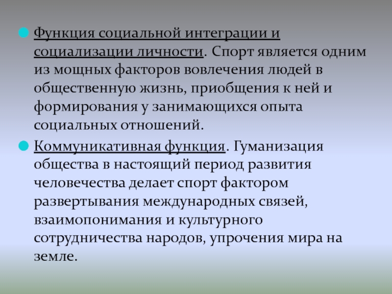 Коммуникативная функция. Гуманизация общества в настоящий период развития человечества делает спорт фактором развертывания международных связей, взаимопонимания и культурного сотрудничества народов, упрочения мира на земле.