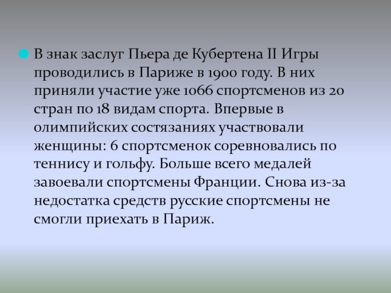 В знак заслуг Пьера де Кубертена II Игры проводились в